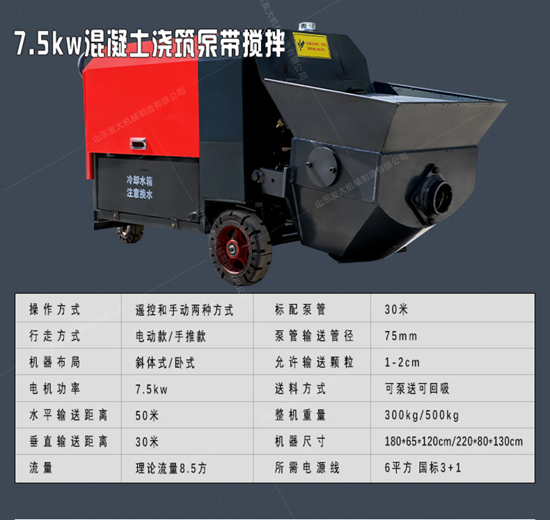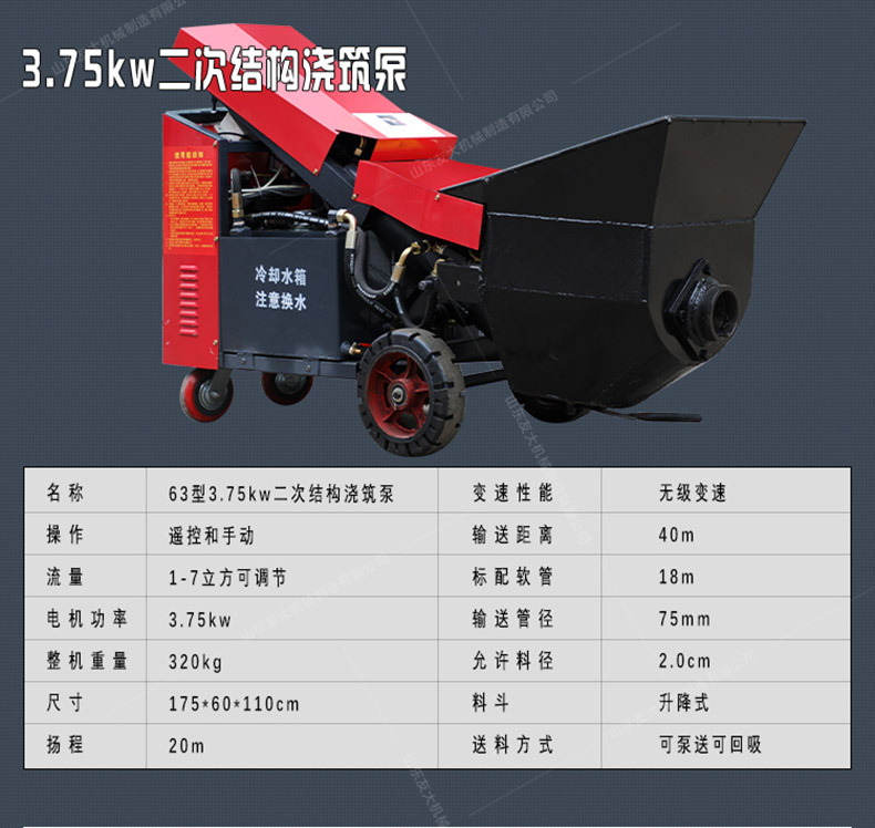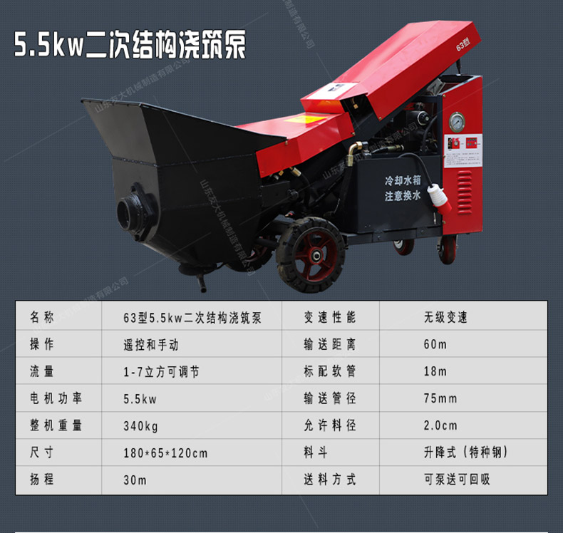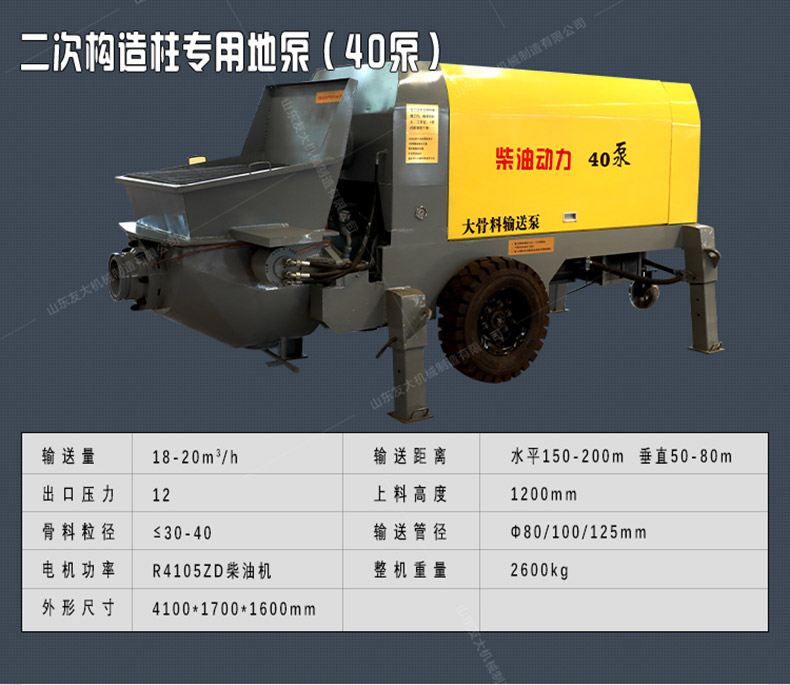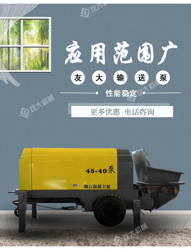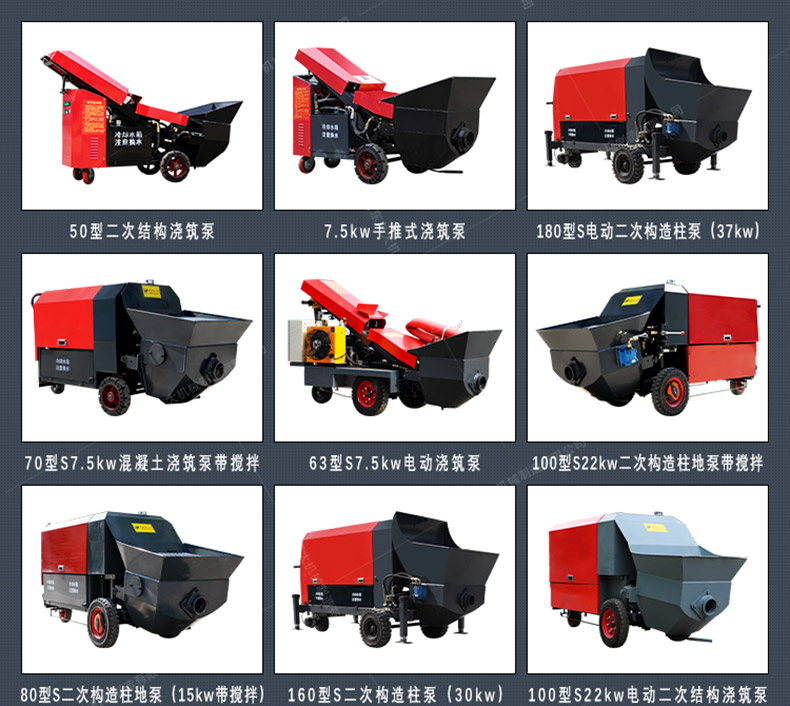 细石混凝土输送泵用于混凝土施工中的输送和浇注工作。应用范围主要是应用在坡道灌浆、水平地面、隧道浇筑。模板灌浆等。...