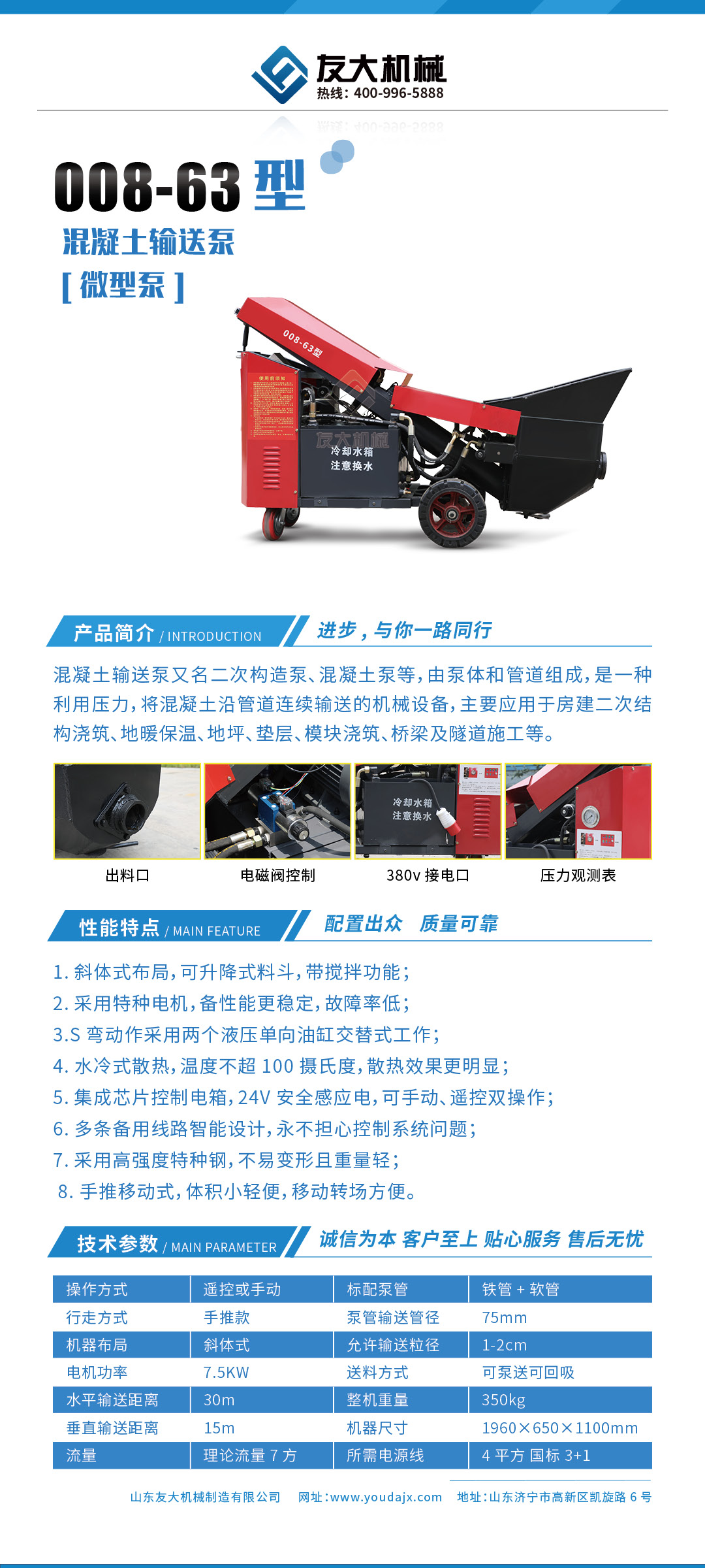 采用泵车尾轮驱动系统轻松解决移动时带来的各种困难,采用双排风冷散热系统散热效果更好,液压系统采用压力更高,性能更稳定的柱塞式自动变量主油泵,采用先进的三维立体压模一体式自动搅拌料斗可输送...