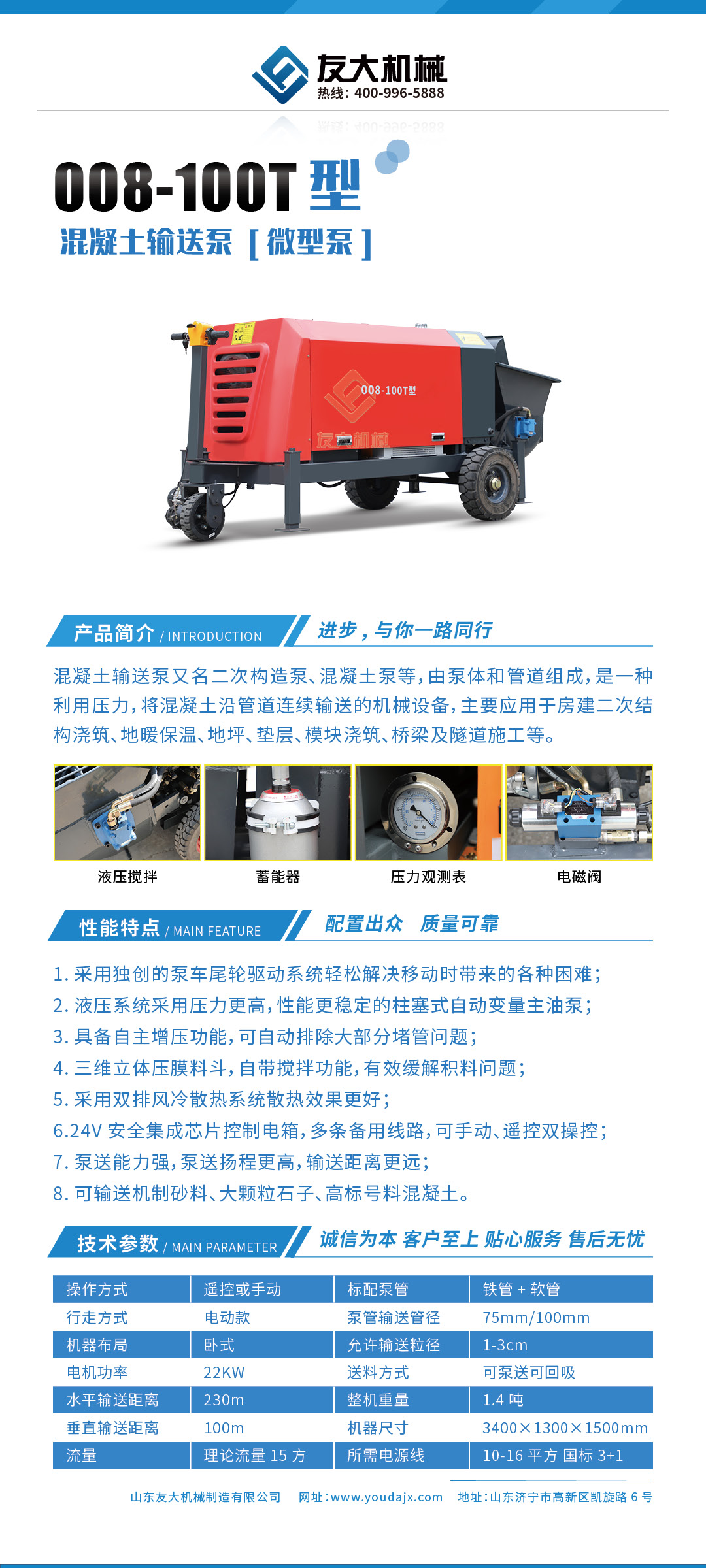 采用泵车尾轮驱动系统轻松解决移动时带来的各种困难,采用双排风冷散热系统散热效果更好,液压系统采用压力更高,性能更稳定的柱塞式自动变量主油泵,采用先进的三维立体压模一体式自动搅拌料斗可输送...